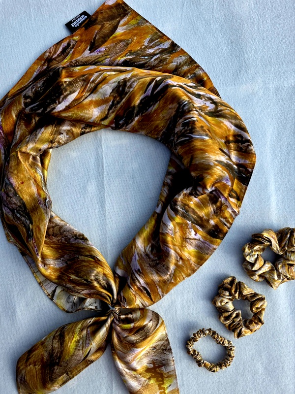 The Golden Sand scarf by Anda_Abstract is a luxurious 100% natural satin silk accessory, featuring elegant golden-yellow and brown tones that reflect the warmth and beauty of nature. Handcrafted from 12 mm Mulberry silk, it offers a soft, breathable texture and a graceful drape for any season. This timeless Latvian-made scarf adds sophistication to both everyday looks and special occasions.