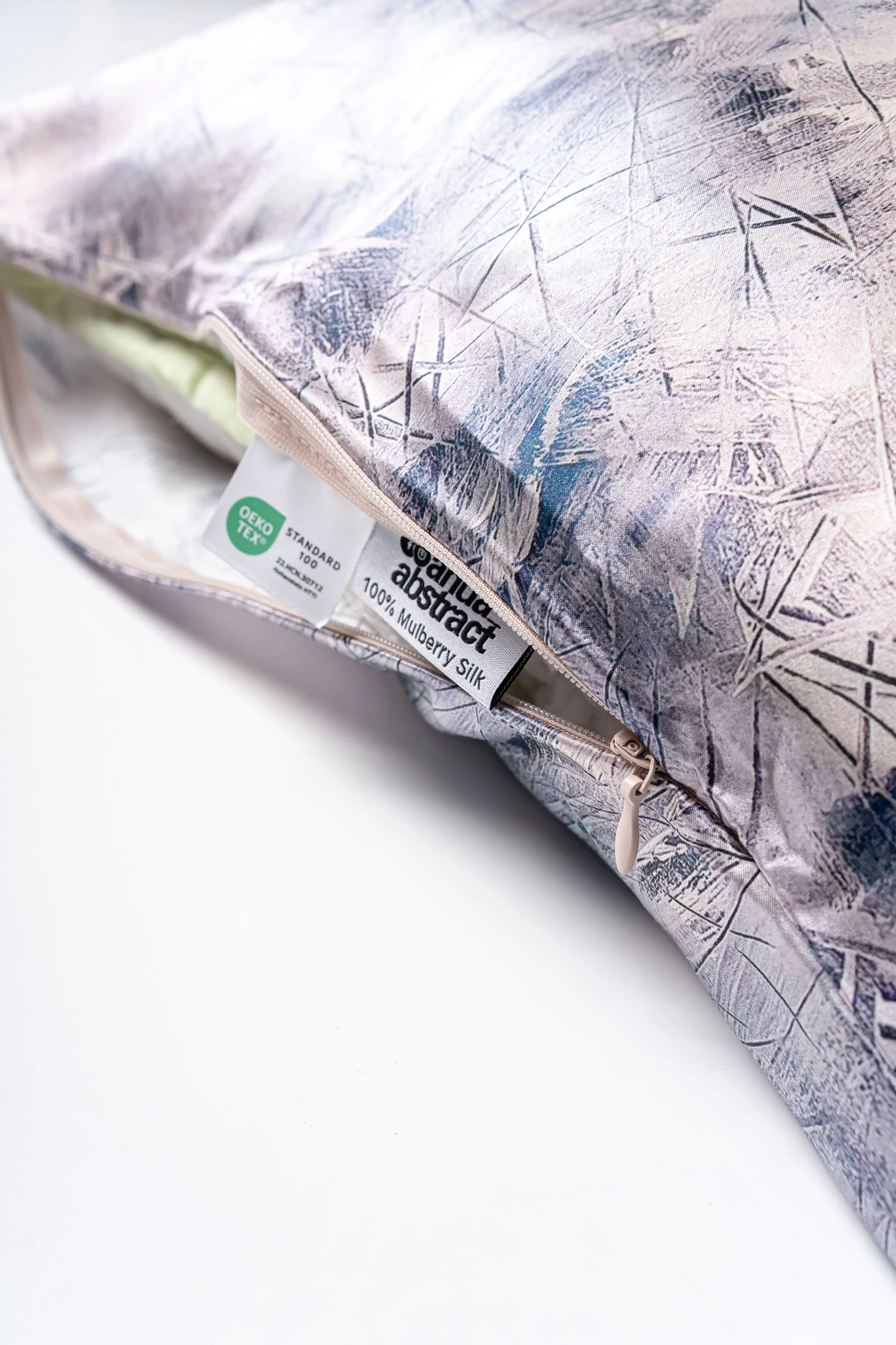 This 50×70 cm pillowcase is created from an original abstract design by Latvian artist Anda Neimane (AndaAbstract) – capturing the essence of ice crystals, frosty geometry, and shimmering winter energy. A delicate metallic silver-blue-grey background with sharp, faceted lines and delicate frost patterns, printed on premium natural silk satin using high-definition digital technique.